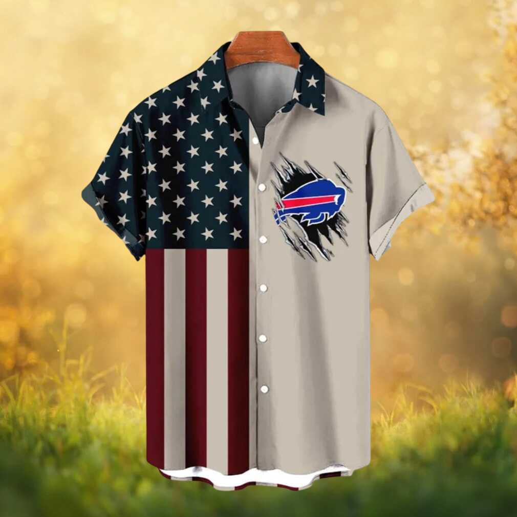 A patriotic claw-rip effect tearing through the American flag reveals the Buffalo Bills logo underneath in this bold Hawaiian shirt. The dramatic, high-energy design is made for fans who tear it up for Bills Nation every game day.