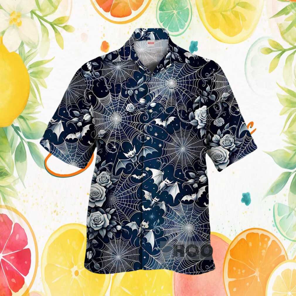 ()Gothic Spiderweb & White Rose Bat Pattern Hawaiian Shirt Dark Floral Nocturnal Style, Treat yourself or make a great gift for your loved ones