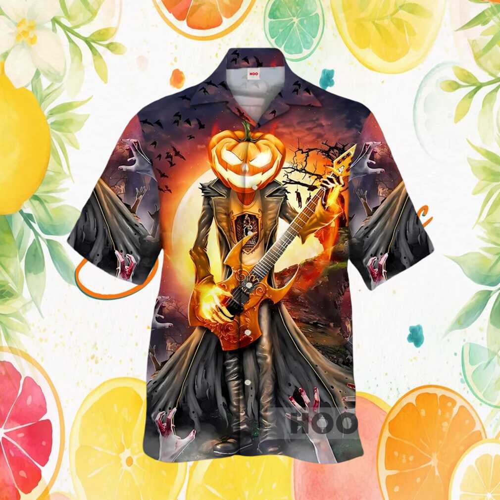 Halloween Jack O Lantern Rocker Guitarist Pumpkin Head Graphic Hawaiian Shirt