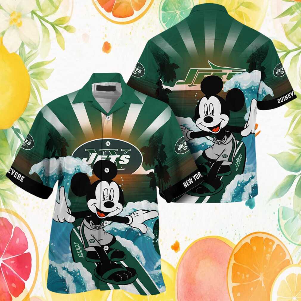 Mickey Mouse Surfing New York Jets Sunset Ocean Hawaiian Shirt