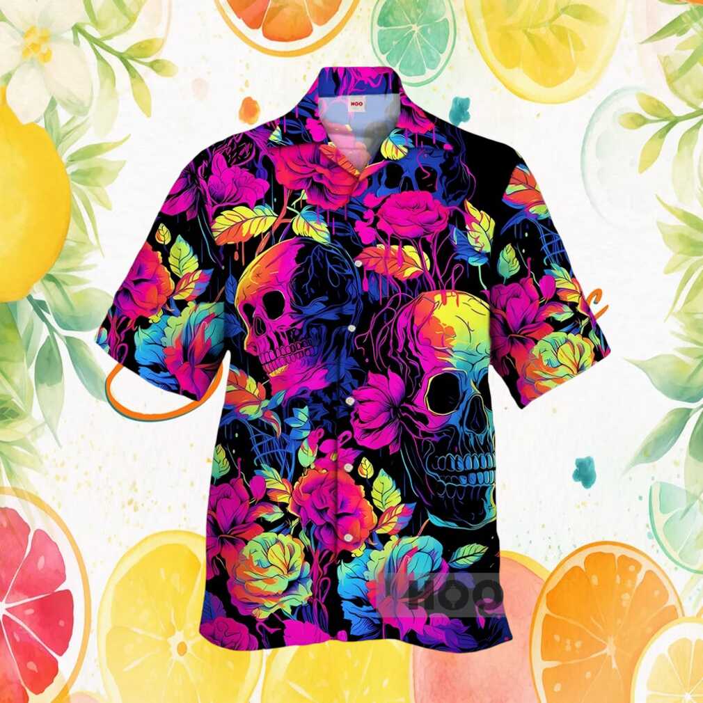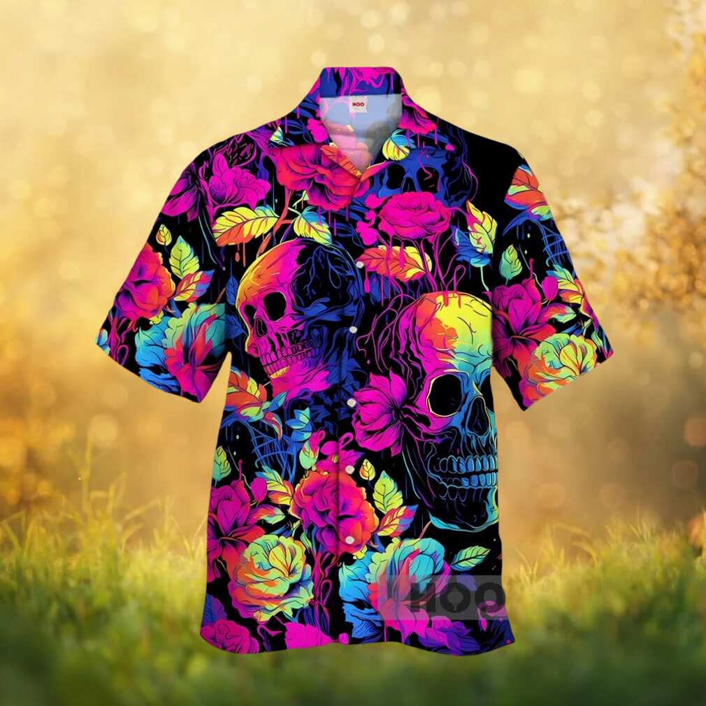 ()Neon Psychedelic Skull & Roses Floral Black Hawaiian Shirt, Treat yourself or make a great gift for your loved ones
