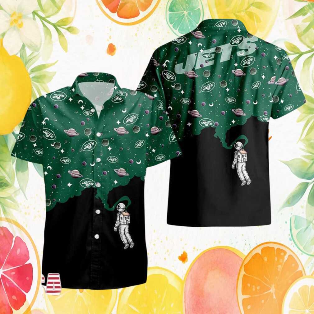 Blast off in Jets style! This out-of-this-world Hawaiian shirt features an astronaut floating through a colorful galaxy against a cosmic background. NY Jets branding integrates seamlessly with the space exploration theme, making it a uniquely cool shirt for fans with their heads in the stars.
