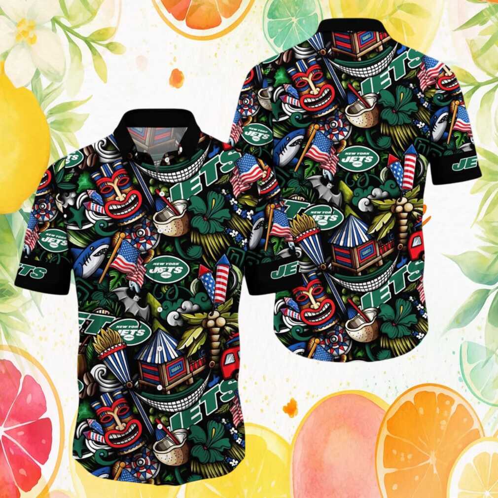 New York Jets Patriotic Tiki Party & American Flag Hawaiian Shirt