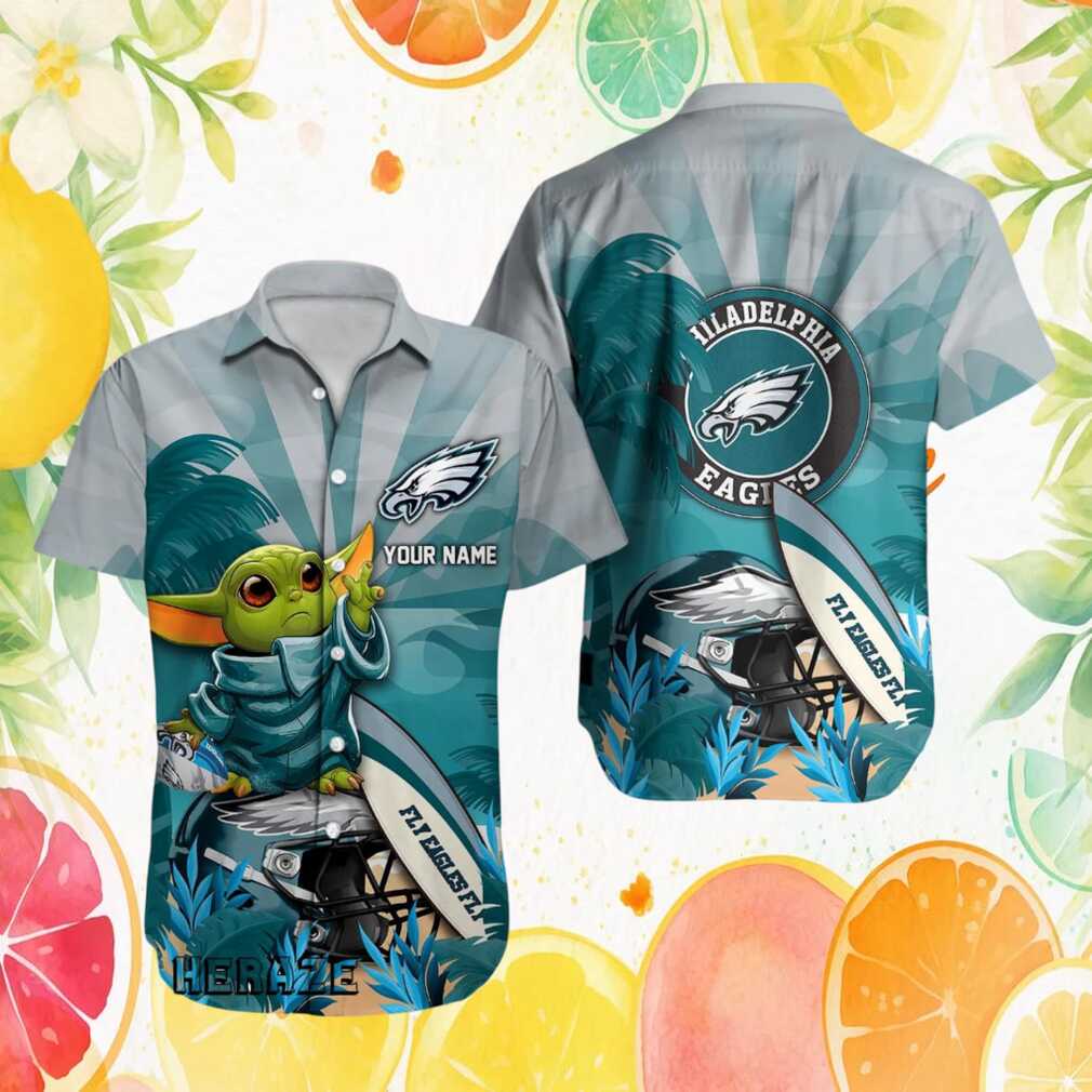 Show off your Philadelphia Eagles pride with a fun twist — this Hawaiian shirt features the beloved Grogu (Baby Yoda) set against a vibrant tropical background. Perfect for game days, beach outings, or casual summer hangouts. Add a personal name for a truly one-of-a-kind gift!