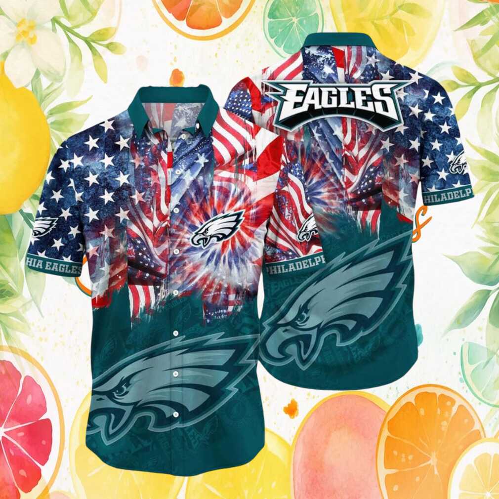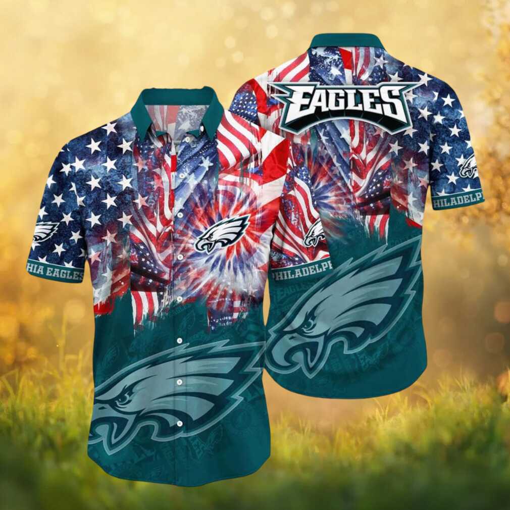 Celebrate both your love of Philadelphia Eagles and American pride with this patriotic Hawaiian shirt. Bold flag motifs and fireworks graphics come together in team colors for a perfect 4th of July or gameday statement piece.