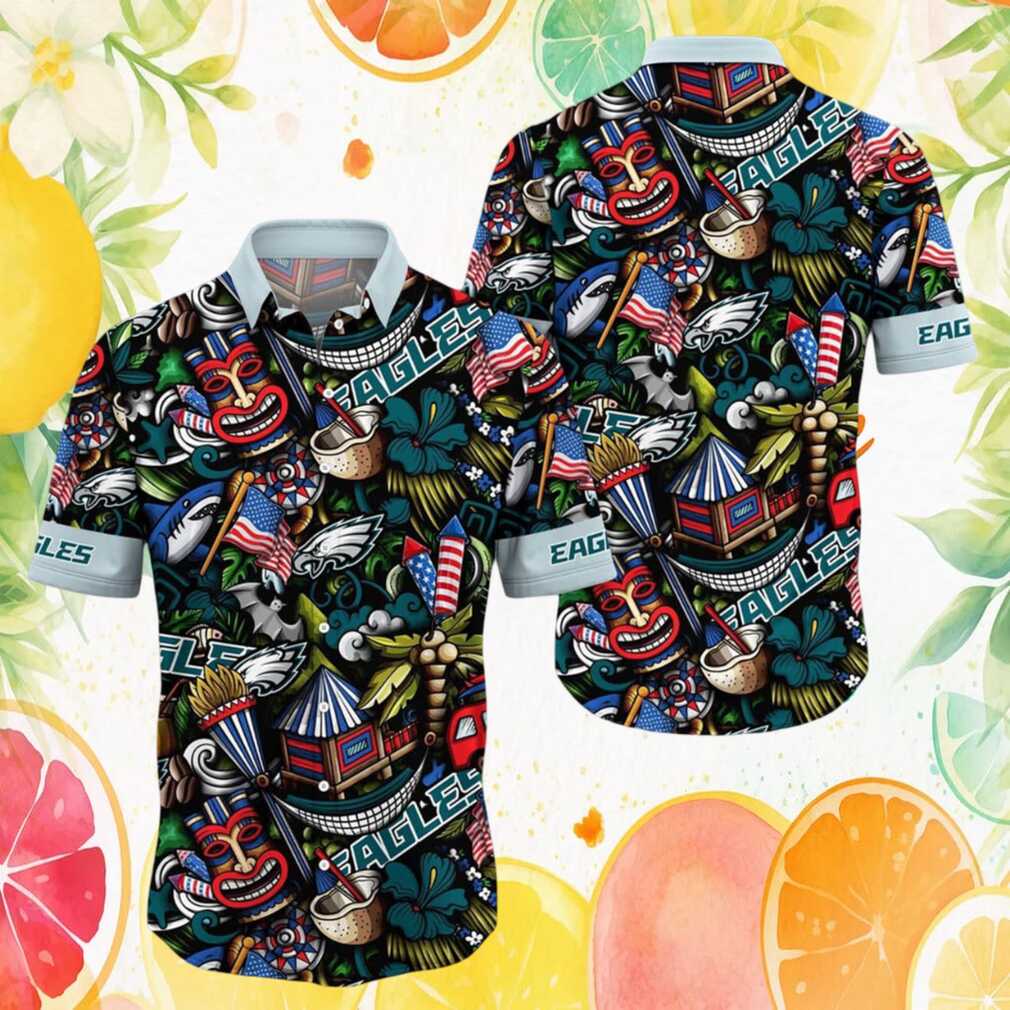 Celebrate both your love of Philadelphia Eagles and American pride with this patriotic Hawaiian shirt. Bold flag motifs and fireworks graphics come together in team colors for a perfect 4th of July or gameday statement piece.