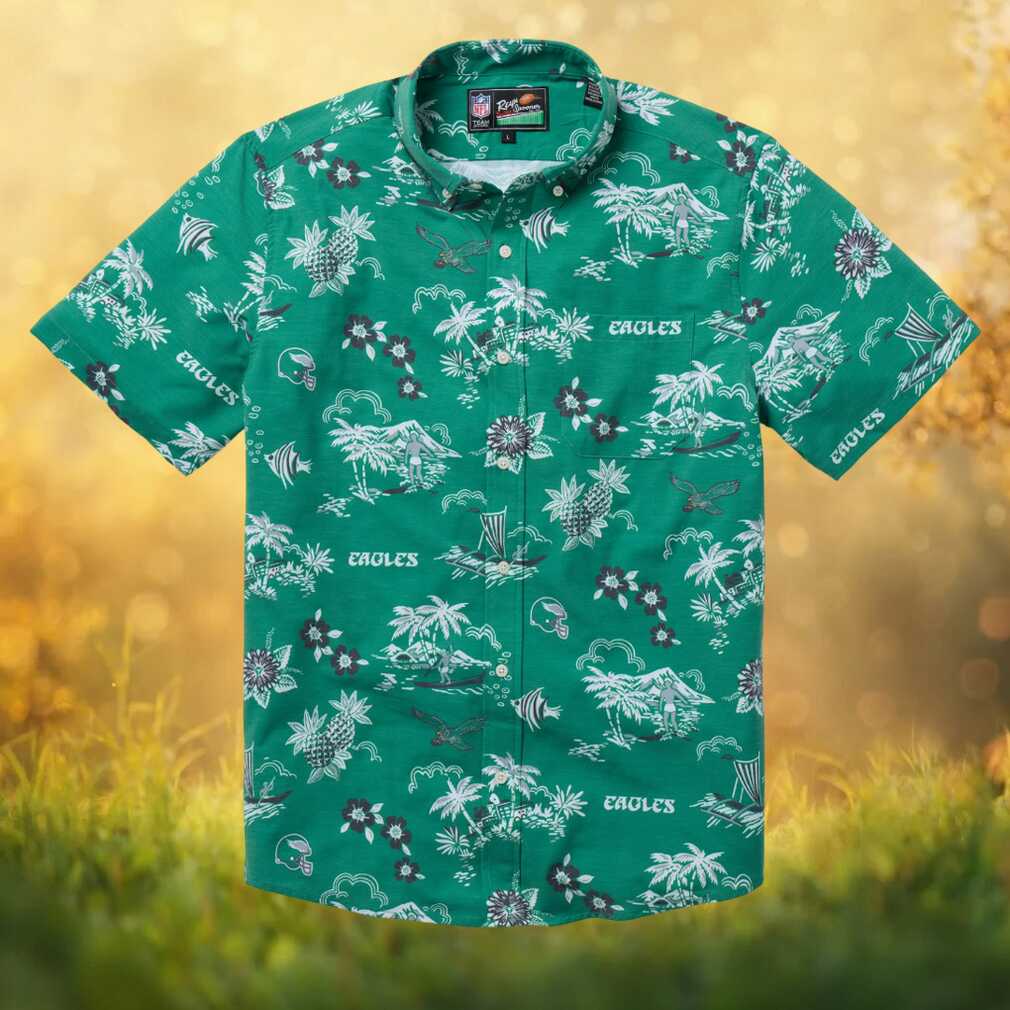 Rep your team in style with this officially licensed Reyn Spooner Philadelphia Eagles Hawaiian shirt. Featuring a stunning scenic/stadium print in green, this button-down shirt blends authentic Hawaiian craftsmanship with passionate NFL fan spirit. Crafted from premium spoiler cloth for a comfortable, relaxed fit perfect for game days, tailgates, vacations, or any casual occasion. A must-have for any die-hard fan.