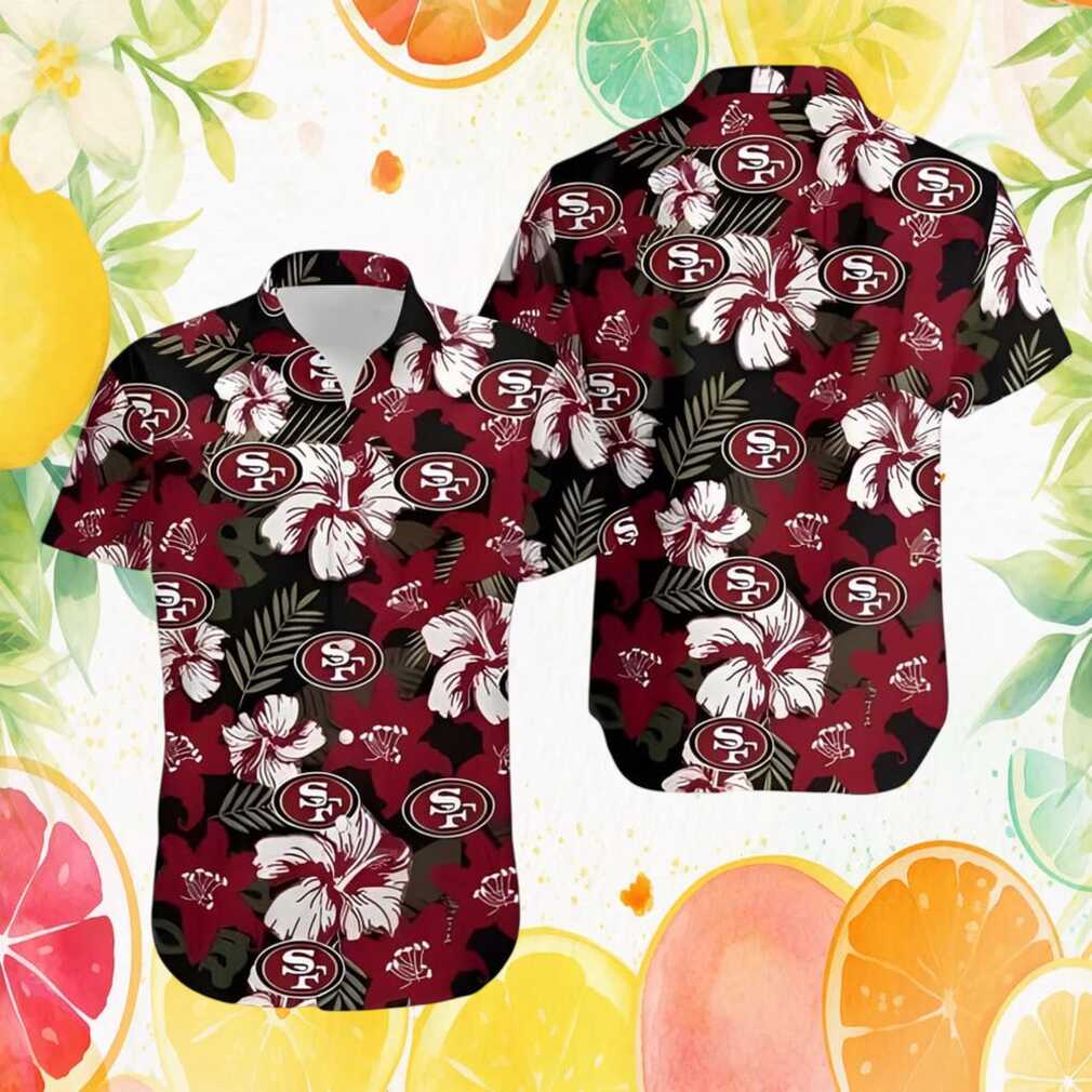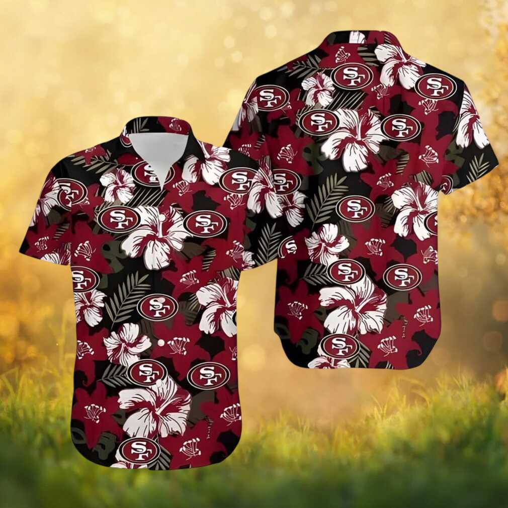 Show your San Francisco 49ers pride in style with this eye-catching Hawaiian shirt featuring lush tropical hibiscus florals and swaying palm trees in scarlet red and gold tones. Crafted from lightweight, breathable fabric with a comfortable button-up design and short sleeves, this shirt is a go-to shirt for beach days, barbecues, and game-watching parties. Available in a full range of sizes, it makes a fantastic gift for any 49ers fan.